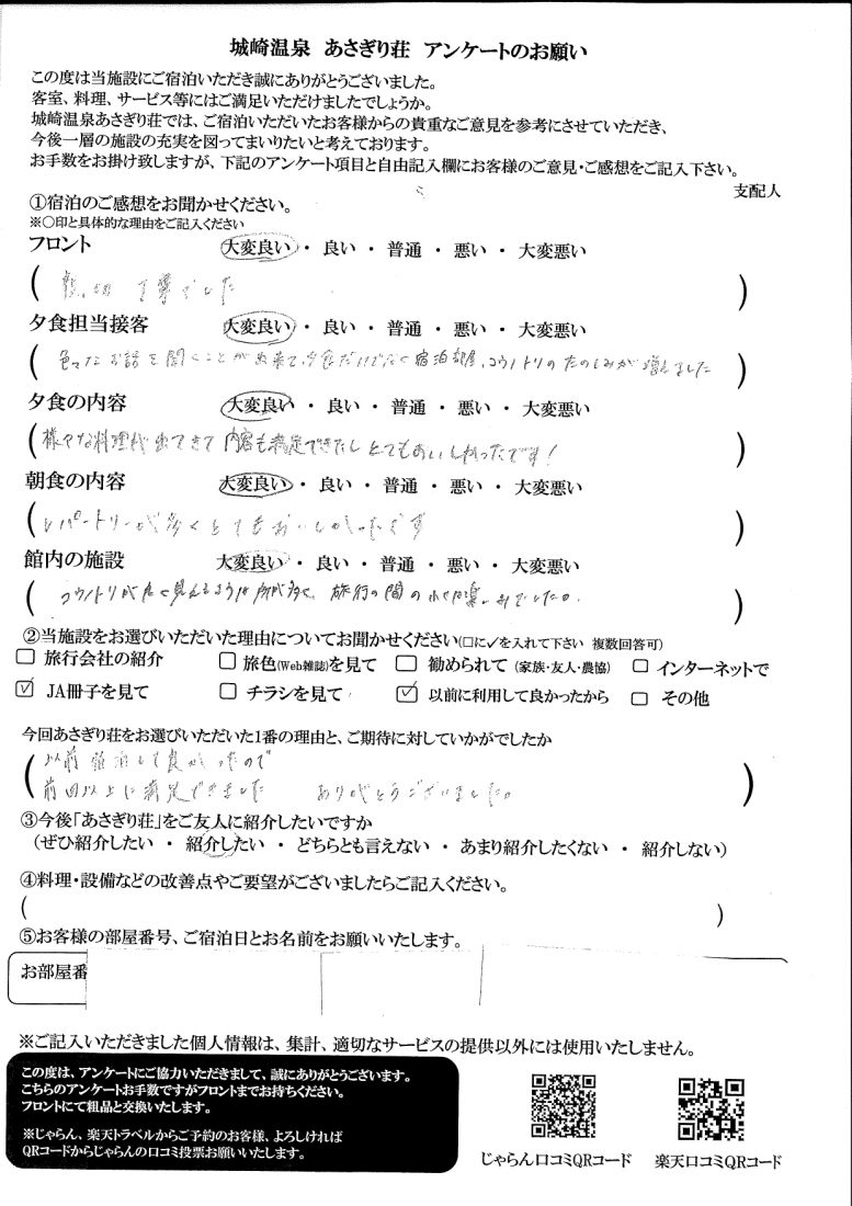 当館のお食事、JAの保養所として地の食材を中心に安心・安全で、質の高い食材を提供しており、ご利用のお客様に高評価を頂いており、今回お客様にも大変喜んでいただけたようで嬉しく思っております。